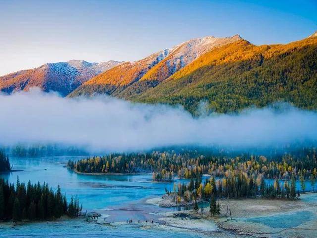 喀纳斯湖畔风光好,碧波荡漾映晴空。